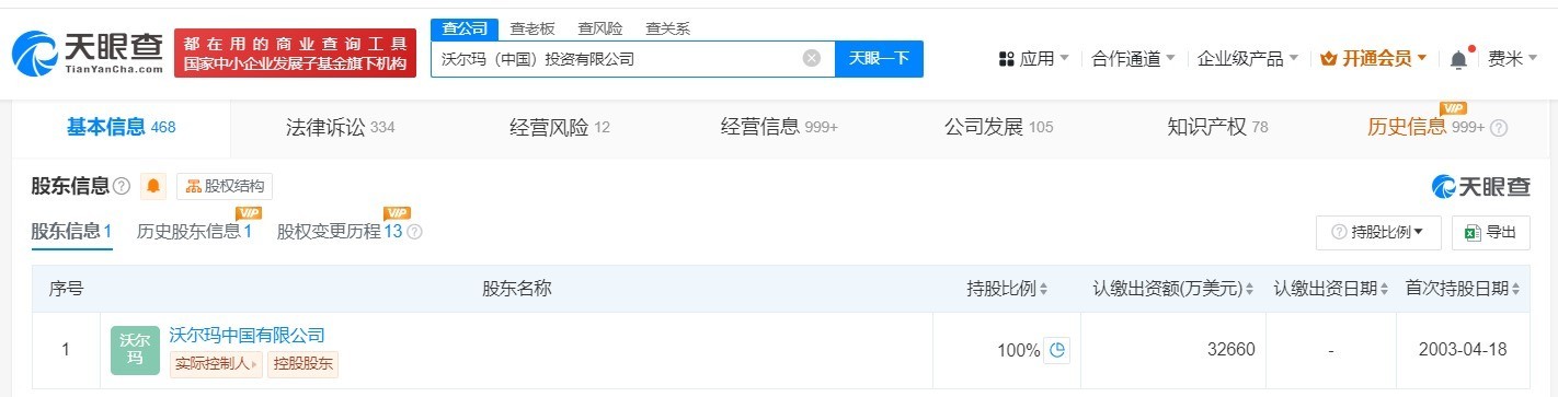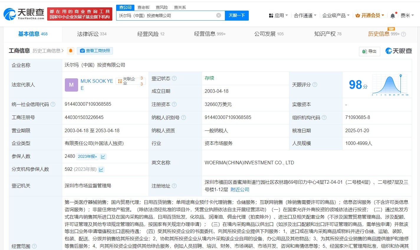 该公司成立于2003年4月,法定代表人为MUK SOOK YEE,注册资本约3.3亿美元,经营范围含第一类医疗器械销售、国内贸易代理、日用百货销售、单用途商业预付卡代理销售、仓储服务、互联网销售等,由沃尔玛中国有限公司全资持股。